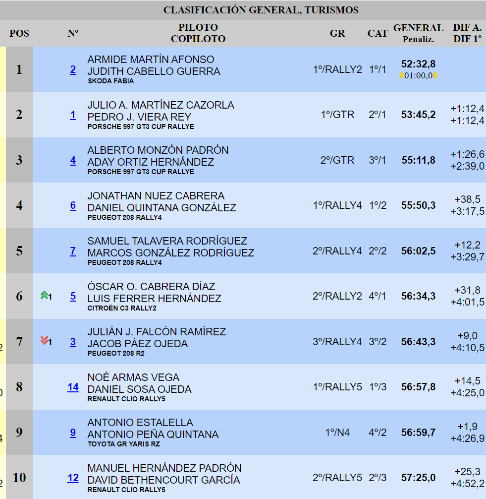 El piloto del Skoda Fabia R5 consigue en la villa mariana su cuarta victoria del curso. Junto a Judith Cabello, suma un botín que le sitúa a dos puntos del primer puesto del Campeonato Provincial de Las Palmas de Rallyes sobre Asfalto, todavía en las manos de Julio Martínez. El abanderado de Auto-Laca Competición remata su jornada en la prueba de Escudería Aterura con un pleno de triunfos parciales. El del Porsche 997 GT3 Cup Rallye 2010, con Pedro Viera a su derecha, dedica la última sección a probar diferentes reglajes en su Porsche. Alberto Monzón y Aday Ortiz les acompañan en los puestos de privilegio.