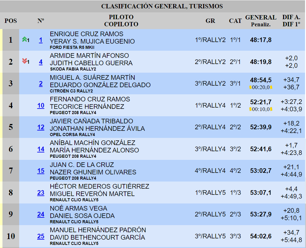 Fernando Cruz y Tecorice Hernández ruedan en P4 con el Peugeot 208 Rally4. Los tinerfeños endosan cerca de veinte segundos a sus perseguidores más próximos, en la clasificación absoluta y dentro de la Rally&You BP Ultimate Plus Car Cup. Javier Cañada y Jonathan Hernández, quintos, no encuentran una explicación a la caída de rendimiento de su Opel Corsa Rally4, una reducción de prestaciones que sitúa a Aníbal Machín y María Hernández, con otra unidad Peugeot 208 Rally4, a un suspiro de darles caza.