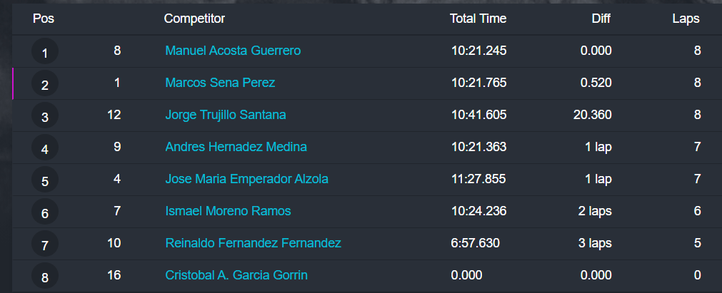 En el siguiente round, las opciones al doblete de Fernández fueron evaporadas por una avería. Acosta, que había ascendido a la primera posición nada más apagarse el semáforo, encontró otra oportunidad para subir al peldaño más alto del podio. Ahora, debía resistir a los ataques de Sena. Con la lección de la carrera anterior aprendida, Manuel cerró la puerta a su adversario y volvió a degustar las exquisitas mieles del triunfo en un recinto por el que siente una infinita afinidad. Jorge Trujillo completó el podio.