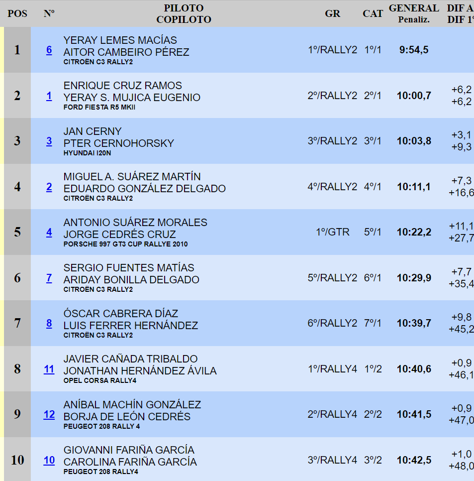 El piloto conejero lidera la última prueba del Campeonato de Canarias de Rallyes sobre Asfalto al término del primer día de competición. En su reencuentro con un Citroën C3 Rally2 de Sports&You Canarias, el ídolo local registró el tiempo de referencia en la especial de ‘El Mojón-Los Valles-Las Nieves-Tabayesco-Haría’. Con Aitor Cambeiro a las notas, endosó poco más de seis segundos a los siguientes clasificados, Enrique Cruz y Yeray Mujica. Los del DISA Copi Sport, ya sin opciones en la batalla por la corona del ‘Mundialito’, preceden a los checos Jan Cerný y Petr Cernohorsky. Miguel Suárez y Eduardo González, cuartos.