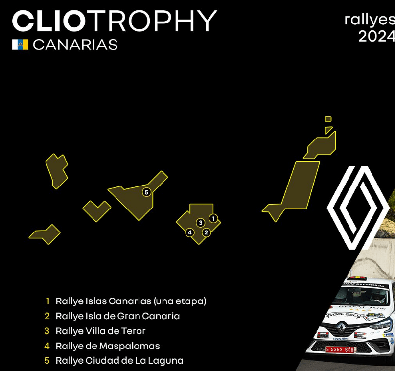 El Clio Trophy Canarias 2024 cuenta con cinco rondas en su calendario. La tercera edición del certamen monomarca que organizan Renault Group España y Driveland Events, junto las filiales insulares, tendrá pruebas tanto en la isla de Gran Canaria como en la de Tenerife. La provincia oriental carga con un peso mayor que la occidental. Las hostilidades empezarán el primer fin de semana de mayo con el 48º Rallye Islas Canarias, mientras el campeonato terminará a finales de octubre con el 51º Rallye de Maspalomas.