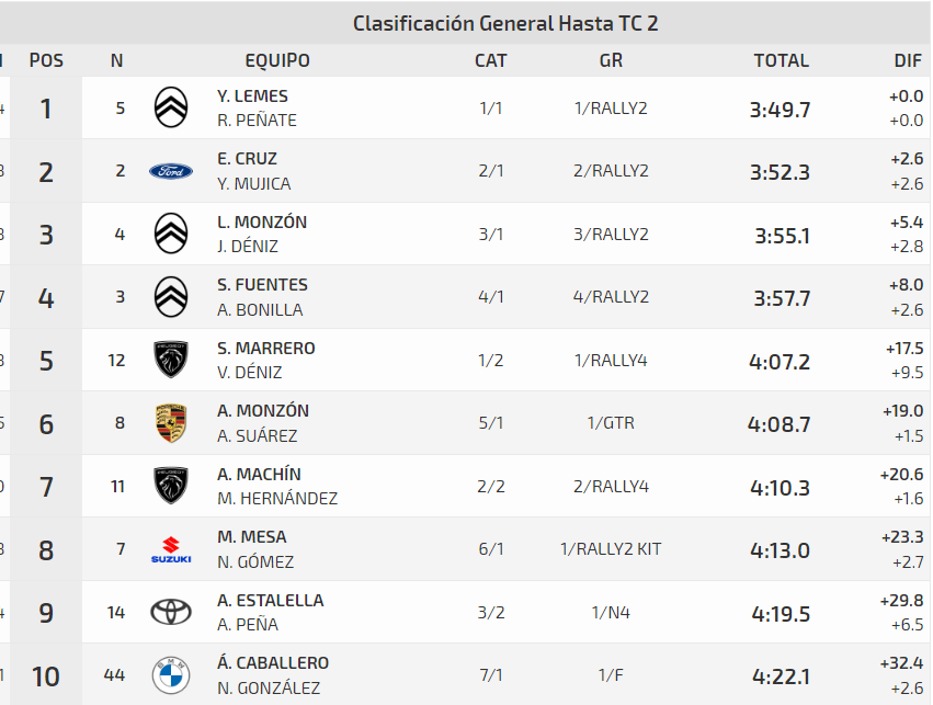 Enrique Cruz y Yeray Mujica ocupan ese segundo lugar de la tabla provisional con el Ford Fiesta Rally2 del DISA Copi Sport. El tinerfeño, responsable de abrir carretera en el TC-2, rodó algo «desconcentrado y disgustado» por lo que minutos antes le había ocurrido a los defensores del título regional. El podio provisional lo cierran Luis Monzón y José Carlos Déniz. El satauteño lamentó la pérdida de «unos cinco segundos» por problemas en la salida. Tampoco se mostró satisfecho con el rendimiento de su Citroën.