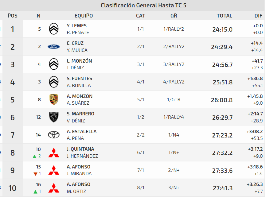 Sergio Fuentes y Ariday Bonilla figuran en la cuarta posición de la provisional con la segunda unidad Citroën C3 Rally2 del equipo Sports&You Canarias. Alberto Monzón y Aday Suárez les vigilan de cerca. Los del Porsche 997 GT3 Rally 2007, a pesar del complejo estado del firme, están a 9.0″ de entrar en el top cuatro. Los locales Samuel Marrero y Víctor Déniz, a bordo de un Peugeot 208 Rally4, comandan un grupo que ya no cuenta con el vehículo de Aníbal Machín y María Hernández, que sufrieron una avería.
