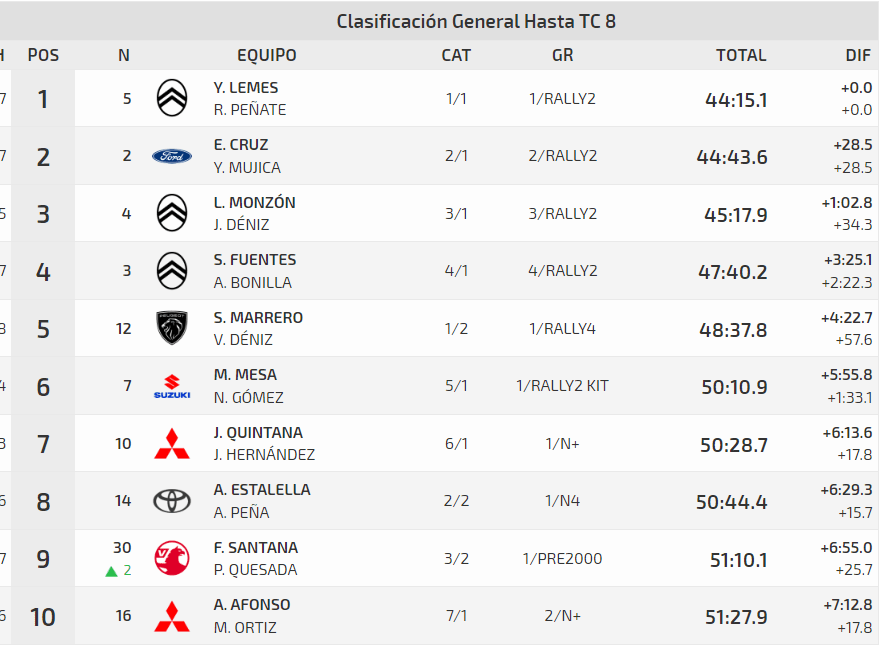 Luis Monzón y José Carlos Déniz siguen en un solitario tercer puesto. Los satauteños van encontrando el camino en su regreso a la competición. Después de una mañana en la que pasaron desapercibidos, los del Citroën C3 Rally2 estuvieron muy cerca de sumar el scratch del tramo de bonificación. Tan solo ocho décimas fueron las que mediaron entre ellos y el Ford Fiesta Rally2 del DISA Copi Sport. Las tres últimas cronometradas les ofrecerán la oportunidad de avanzar en su fase de recuperación del ritmo.