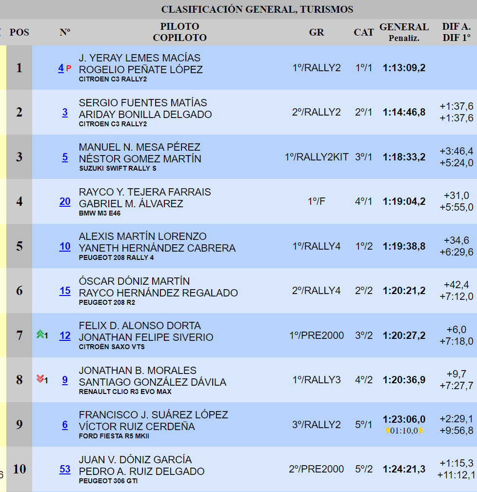 Junto a Rogelio Peñate, el conejero maximizó las bajas de Enrique Cruz y Miguel Suárez para extender su renta en la cima del certamen autonómico a los 17 puntos. Esa diferencia endosa a Sergio Fuentes y Ariday Bonilla, quienes terminaron el evento de Escudería Daute-Realejos en el segundo lugar. También a los mandos de otra unidad Citroën C3 Rally2, los vigentes campeones tinerfeños igualaron su mejor resultado histórico dentro del autonómico y, además, cerraron un doblete para Sports&You Canarias.