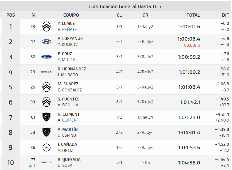 Sergio Fuentes y Ariday Bonilla se encuentran en el sexto puesto con otra unidad Citroën C3 Rally2. El de Candelaria y el de Haría no acumularon tantos kilómetros como les hubiese gustado debido a las numerosas neutralizaciones que encontraron en su camino. Los hermanos Nelson y Ayoze Climent, en su P7, encabezan la categoría Rally4 y la Rally&You BP Ultimate Plus Car Cup con su Peugeot 208. A su espalda aparecen Alejandro Martín-Gabriel Espino, Javier Cañada-Aday Ortiz y Raúl Quesada-Dani Sosa.