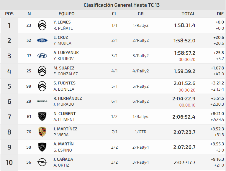 El debut de Raúl Hernández y José Murado con el Skoda Fabia RS Rally2 estuvo condicionado por un problema con la palanca del cambio en la primera pasada por ‘Moya-Valleseco’. El incidente costó una minutada importante al de Lanzarote. Lo positivo, que acumuló la máxima experiencia posible. Justo a su espalda acabaron Nelson y Ayoze Climent, ganadores de la Rally&You BP Ultimate Plus Car Cup con su Peugeot 208 Rally4. Julio Martínez y Pedro Viera, octavos con su Porsche 997 GT3 Cup Rallye 2010.
