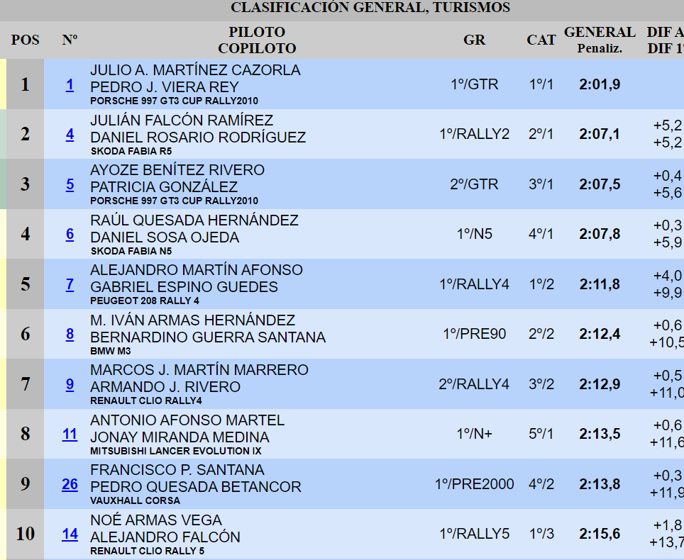 Julián Falcón y Daniel Rosario pasaron por la zona del percance a velocidad reducida, al igual que Ayoze Benítez y Patricia González. Por este motivo, ambos equipos recibieron unos tiempos aplicados por los comisarios. Los del Skoda Fabia R5 se marchan a la cama en la segunda plaza provisional, mientras que los del Porsche 997 GT3 Cup Rallye 2010 lo hacen en la tercera. Su desventaja con los líderes supera la frontera de los cinco segundos, déficit que están obligados a contrarrestar en las especiales que restan.