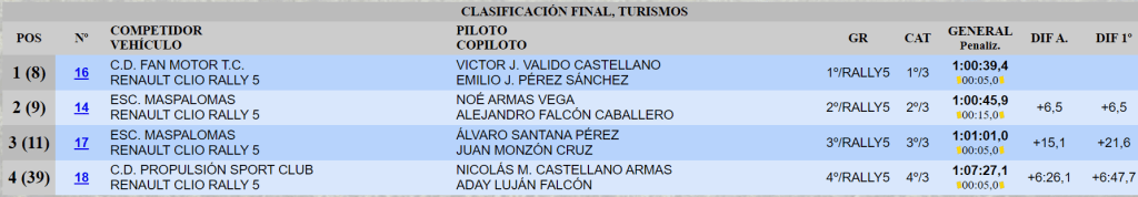 Víctor Valido estrena su palmarés de victorias dentro del Clio Trophy Canarias. El piloto teldense impuso su Renault Rally5 en el 63º Rally Isla de Gran Canaria, la segunda cita en el calendario de la monomarca francesa. Junto a Emilio José Pérez, resultó vencedor de una tensa partida de ajedrez contra Noé Armas y Alejandro Falcón. El de Fataga, esta vez segundo, afianza su liderato en la tabla de puntos tras el cero de Iván Cabrera y Rayco Almeida, quienes también estuvieron inmersos en la lucha por el primer lugar.