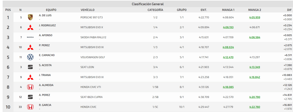 Pedro Pérez, con solo un registro para figurar en clasificación, concluyó cuarto con un Mitsubishi Lancer Evo IX que cada vez está más cerca de formar parte del selecto grupo de favoritos a grandes resultados. Édgar Camacho, rodando al límite de las posibilidades de su Volkswagen Golf, terminó quinto, justo por delante de Sergio Acosta y su Seat León. Joel Triana (Mitsubishi Evo IX), Ayoze Almeida (Honda Civic VTI), Antonio J. Pérez (Seat Ibiza Cupra) y Roberto García (Honda Civic) se situaron a continuación en la tabla.