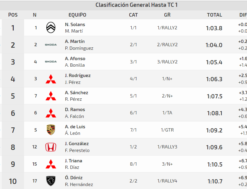 Los catalanes, a los mandos de un Citroën C3 Rally2 del equipo Sports&You Canarias y con una librea elaborada para la ocasión, marcaron el ritmo en su primera toma de contacto en el asfalto palmero. Los grancanarios, de vuelta a la provincia occidental tras más de cinco años, situaron su Skoda Fabia R5 justo a espaldas del equipo foráneo. La escasa diferencia que les separa hace presagiar un fin de semana de muy intensas batallas en la carretera.