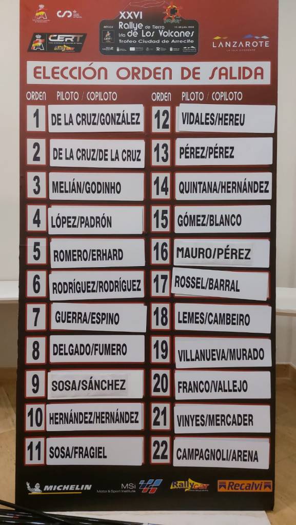 Yeray Lemes y Aitor Cambeiro arrancarán justo detrás de las estrellas mundialistas, o lo que es lo mismo, en la decimoctava posición. Y a espaldas del dueto del Škoda Fabia R5 saldrán quienes lideran la Copa de España de Rallies de Tierra (CERT), Alexander Villanueva y José Murado. Los del Škoda Fabia RS Rally2 tomarán la partida por delante de Sebastián Franco-Diego Vallejo (Citroën C3 Rally2) y de Joan Vinyes-Jordi Mercader (Hyundai i20 N Rally2).