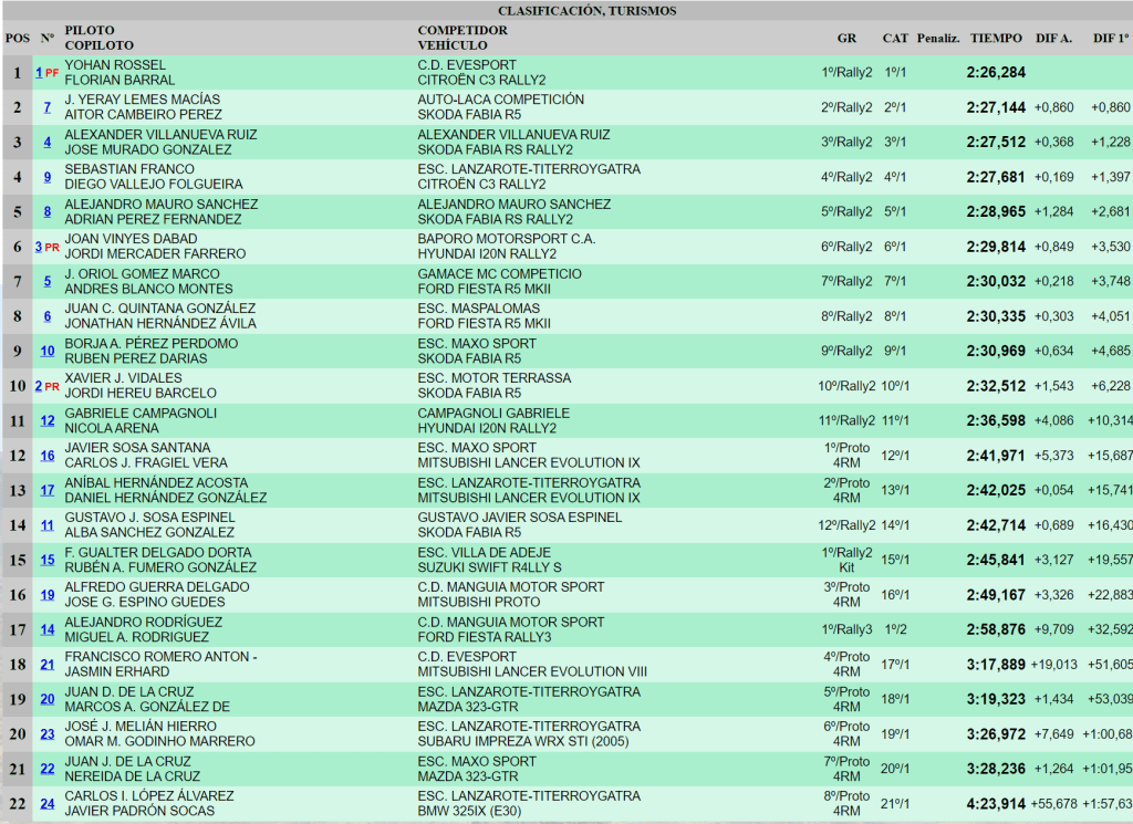 Los Škoda Fabia R5 de Borja Pérez-Rubén Pérez y Xavier Vidales-Jordi Hereu se situaron al fondo del top diez. Los italianos Gabriele Campagnoli y Nicola Arena fueron undécimos con su Hyundai i20 N Rally2. Los majoreros Javier Sosa y Javier Fragiel encabezaron la nómina de coches Proto 4RM con un Mitsubishi Lancer Evo IX que dirigieron al duodécimo puesto. Aníbal Hernández y Daniel Hernández, con otro artefacto de la firma japonesa, fueron P13.