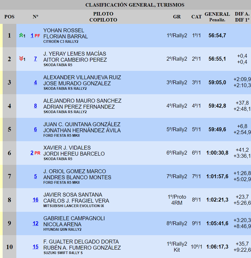 Javier Sosa y Carlos Javier Fragiel culminaron su remontada en el octavo puesto, treinta por encima de donde habían pasado la noche del sábado. El dueto del Mitsubishi Lancer Evo IX precedió en la tabla a los italianos Gabriele Campagnoli-Nicola Arena, que firmaron el mejor resultado de su trayectoria deportiva con un Hyundai i20 N Rally2. El top diez se encargaron de completarlo Walter Delgado y Rubén Fumero con su Suzuki Swift RALLY S Rally2-Kit.