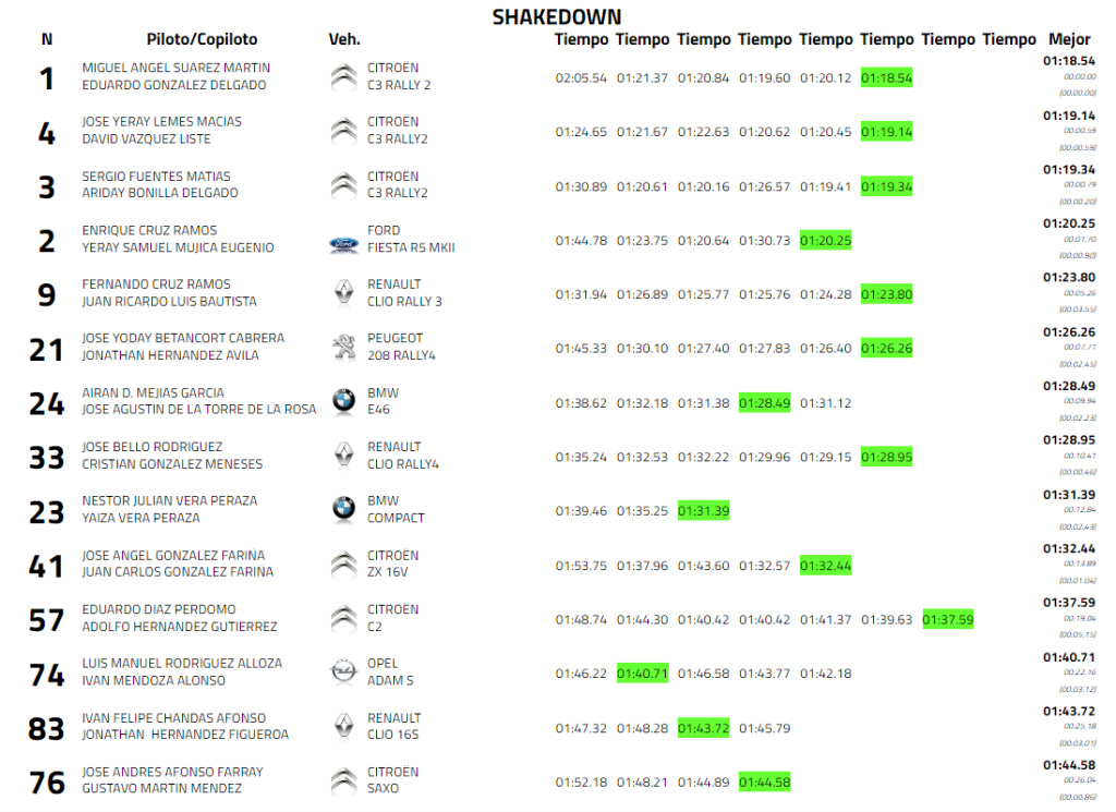 Los Citroën C3 Rally2 mandan en el Shakedown del 10º Rallye Ciudad de La Laguna. El trío de unidades de Sports&You Canarias encabezó la clasificación del tramo de pruebas, el de ‘La Barranquera’. Al frente de ese triplete, los vigentes campeones del ‘Mundialito’, Miguel Suárez y Eduardo González. El palmero y el grancanario, que completaron un total de seis pasadas, fueron los únicos participantes capaces de romper la barrera de tiempo del 1:19.