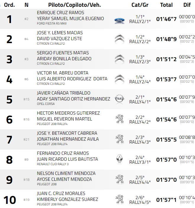 En el tercer lugar descansarán Sergio Fuentes y Ariday Bonilla (Citroën C3 Rally2), mientras que en el cuarto lo harán Víctor Abreu y Luis Rodríguez (Citroën C3 Rally2), lastrados por el no funcionamiento del sistema anti-lag en su vehículo. Quintos absolutos, y al frente de la Rally&You BP Ultimate Plus Car Cup, están Javier Cañada y Aday Ortiz (Opel Corsa Rally4). Eso sí, empatados a la décima con Héctor Mederos y Miguel Reverón (Peugeot 208 Rally4).