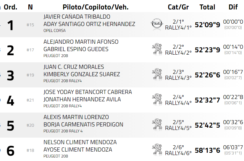Terceros concluyeron Juan Carlos de la Cruz y Kimberly González, muy regulares a bordo de su Peugeot 208 Rally4. Los jóvenes Yoday Betancort y Jonathan Hernández acabaron en P4 y con un scratch a su nombre, mientras que Martín y Carmenatis se hicieron con una quinta posición. Los hermanos Nelson y Ayose Climent cerraron la clasificación. Un toque en ‘Valle de Guerra’ les ocasionó un pinchazo que tiró por tierra cualquier sus posibilidades de ganar.
