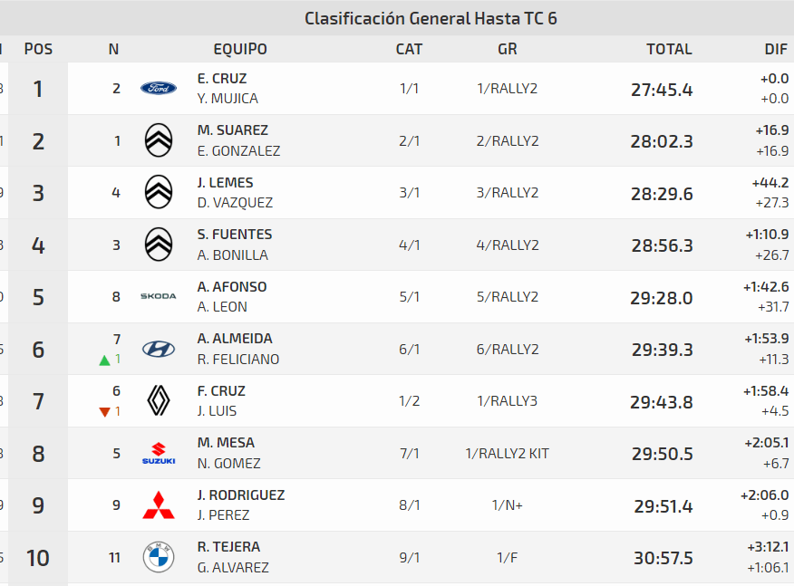 Sergio Fuentes y Ariday Bonilla, más satisfechos con su velocidad, continúan instalados en el cuarto puesto de la general con su Citroën C3 Rally2. Alejandro Afonso y Alberto León son otros de los que no se han movido en la tabla. Conservan un sexto lugar que Ayoze Almeida y Rubén Feliciano pretenden asaltar. Los del Hyundai i20 N Rally2 ya han logrado recuperar lo que habían perdido con su trompo en el TC-3 en relación a Fernando Cruz y Manolo Mesa.