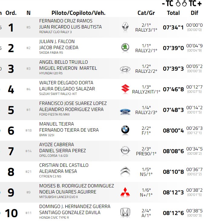A espaldas del top cinco aparece el BMW 325i de Manuel Tejera y Fernando Tejera, que se han establecido como los más cercanos a los que comparten monturas FIA. Ayoze Cabrera y Daniel Sierra ruedan séptimos sobre su Opel Corsa A GSI. Cristian del Castillo y Alejandra Mesa van octavos con el Citroën C3 N5. Moisés Rodríguez-Noelia Aguirre (Mitsubishi Lancer Evo X) y ‘Domi’ Guerra-Santi González (Honda Civic Type R) son P9 y P10, respectivamente.