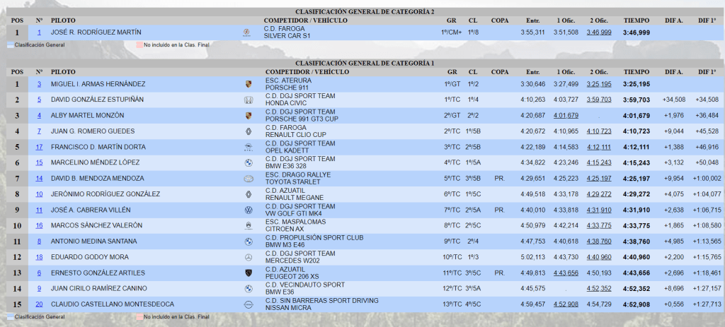 El piloto de Marzagán obtiene su cuarta victoria en la rampa de Ingenio, la primera a los mandos de su actual Porsche 911. A pesar de carecer de oponentes, el pluricampeón de Las Palmas de la modalidad se aplica al máximo e instaura una nueva plusmarca con su registro de la última pasada. David González y Alby Martel le acompañan en el pódium.