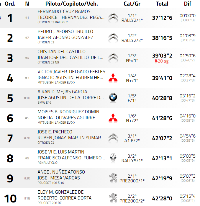 Los del Mitsubishi Lancer Evo X marchan cuartos, mientras el top five lo cierran Airán Mejías y José Agustín de la Torre con su BMW M3 E46. Los tripulantes de otro BMW M3 E46, Rayco Tejera y Gabriel Moisés Álvarez, se quedaron en uno de los incontables cruces del TC3 por culpa de una avería mecánica que ya les había hecho penalizar en la salida de esa especial. La lista de abandonos cuenta con casi veinte equipos, muestra de la exigencia del recorrido.