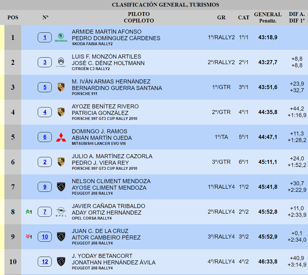 Detrás de la zona de podio, Ayoze Benítez y Patricia González conservan su cuarto lugar con el Porsche 997 GT3 Cup Rallye 2010. El top cinco lo cierran Domingo Ramos y Abián Martín con un Mitsubishi Lancer Evo VIII al que no le amedrenta lo más mínimo el caballaje de los artefactos de Stuttgart. Y es que a espaldas de ellos continúan unos Julio Martínez y Pedro Viera a quienes no les están saliendo las cosas sobre su Porsche 997 GT3 Cup Rallye 2010.