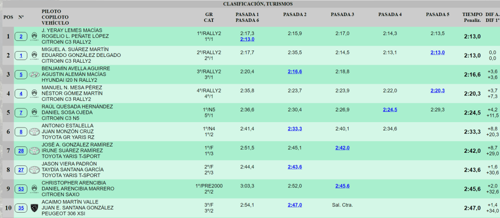 El líder del ‘Mundialito Canario’, que se reencuentra con Rogelio Peñate en el habitáculo de su coche, completó seis pasadas a la especial de ‘Barranco de Moya’. Fue mejorando hasta establecer un 2:13.0 en su manga final, el crono que unos minutos antes había firmado su rival directo. El de Los Llanos de Aridane, con Eduardo González a las notas, pasó en cinco ocasiones por la carretera del Cenobio de Valerón, dejando su marca más veloz en la última.