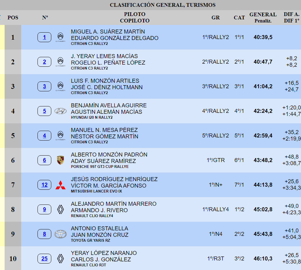 Alberto Monzón y Aday Suárez figuran en el sexto lugar con su Porsche 997 GT3 Cup Rallye, mientras en el séptimo aparecen Jesús Rodríguez y Víctor García con un Mitsubishi Lancer Evo IX al que se están integrando de forma positiva. Alejandro Martín y Armando Rivero son los líderes del grupo Rally4 con un Renault Clio que marcha en P8 de la general. El top diez lo completan Antonio Estalella-Juan Monzón y Yeray López-Carlos González, en ese orden.