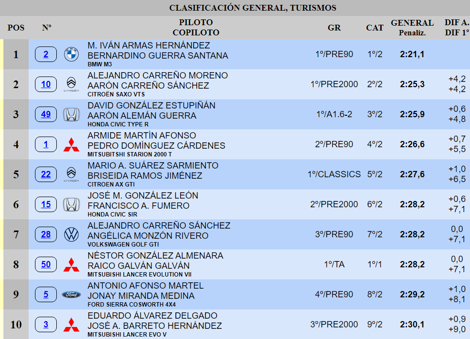Mario Suárez y Briseida Ramos ruedan quintos con su Citroën AX GTI, mientras sextos están José González y Francisco Fumero con su Honda Civic SiR. La séptima plaza es de Alejandro Carreño y Angélica Monzón (Volkswagen Golf GTI), a los que siguen Néstor González y Raico Galván (Mitsubishi Lancer Evo VII). El top diez lo integran Antonio Afonso Jr.-Jonay Miranda (Ford Sierra RS Cosworth 4×4) y Eduardo Álvarez-José A. Barreto (Mitsubishi Lancer Evo V).
