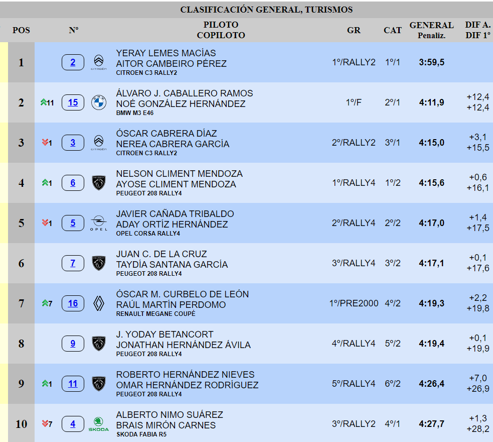 En la segunda plaza de la tabla provisional figuran Álvaro Caballero y Noé González sobre su BMW M3 E46. Los abanderados de Manguia Motor Sport, que se quedaron a 12.4″ del crono de Lemes, endosaron 3.1″ al Citroën C3 Rally2 de Óscar y Nerea Cabrera. La cuarta posición es propiedad de los hermanos Nelson y Ayose Climent con su Peugeot 208 Rally4. Los de la isla de Gran Canaria disponen de un colchón de 1.4″ respecto a Javier Cañada y Aday Ortiz.