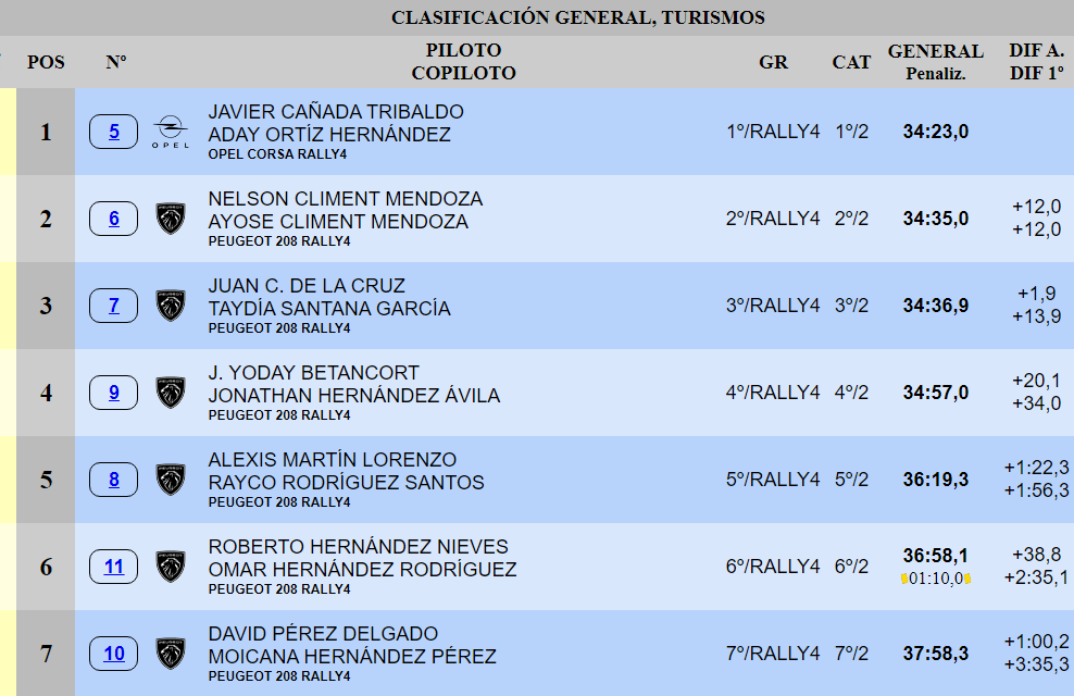 José Yoday Betancort y Jonathan Hernández concluyeron en una solitaria cuarta posición. También con un Peugeot 208 Rally4, la dupla más joven de la copa terminó justo delante de la compuesta por Alexis Martín y Rayco Rodríguez. El tinerfeño, justo de medios, se centró en abrazar los puntos y acabar el año en positivo. Roberto Hernández y Omar Hernández se hicieron con el sexto lugar, mientras el séptimo fue para David Pérez y Mocaina Hernández.