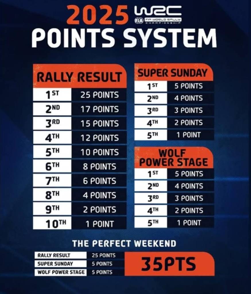 En varios eventos se dio el caso de que el ganador de la general no fue el que más cosecha se llevó al casillero. En Suecia, por ejemplo, Esapekka Lappi sumó 19 puntos con su triunfo y Elfyn Evans, 24 a pesar de acabar en la segunda posición. Las posibilidades de que estas situaciones ocurran en el 2025 decrecen de manera sustancial con la entrada en vigor del nuevo sistema, ya que el vencedor de una prueba se adjudicará, como mínimo, 25 puntos.