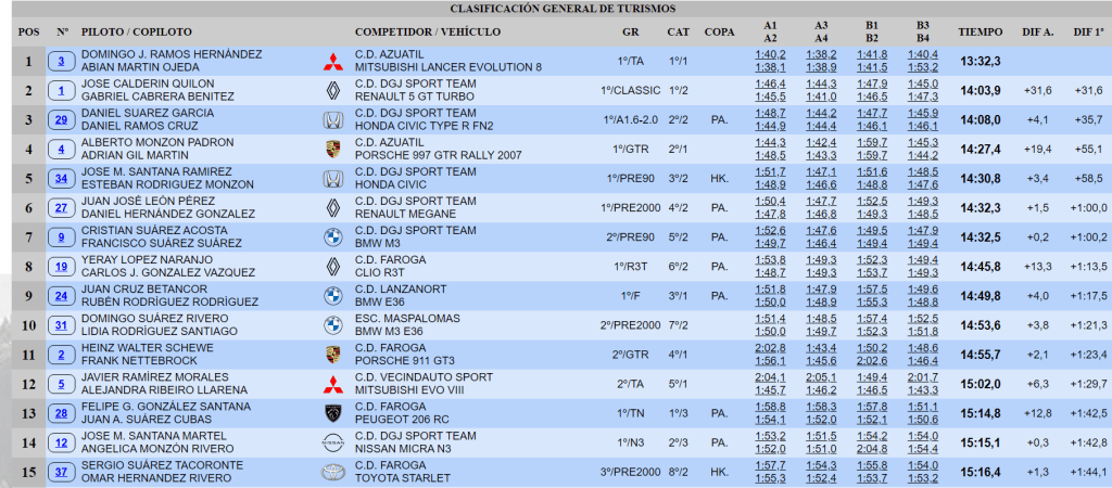 Juan José León y Daniel Hernández terminaron sextos sobre su Renault Megane. El séptimo puesto recayó en las manos de Cristian Suárez y Francisco Suárez, quienes disfrutaron de la conducción de su BMW M3. Yeray López y Carlos González ubicaron su Renault Clio R3T en P8, mientras que Juan Cruz y Rubén Rodríguez se rehicieron de sus infortunios en ‘Era del Cardón’ en una P9. Al fondo del top diez, Domingo Suárez y Lidia Rodríguez con el BMW M3.