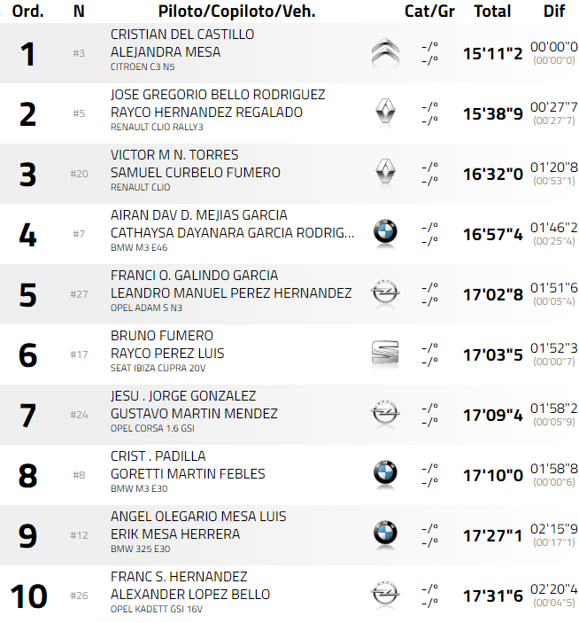 El piloto que mantiene las suyas intactas es Cristian del Castillo. A los mandos de su Citroën C3 N5, el representante de Club Deportivo Seventen domina con mano de hierro. Al término del bucle matinal acumula un colchón que ronda los veinte segundos con respecto a su rival más próximo en la clasificación general. Junto a Alejandra Mesa, dos especiales son las que le separan de llegar a las Navidades con un triunfo, el que sería el primero de su trayectoria.