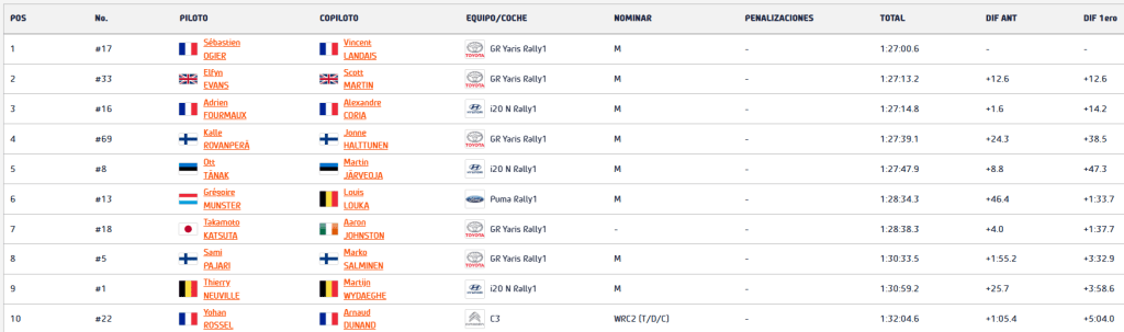 Sébastien asestó otro golpe al vigente subcampeón con su scratch en ‘La Bréole/Selonnet’. Si en la especial anterior, la del único fallo del #33, le había endosado 14.7″, en esa le metió otros 5.8″. El tirón de Ogier tan solo lo aguantó Adrien Fourmaux. En el evento su debut con los colores de Hyundai Motorsport, el deportista galo se ha consolidado en la zona de podio sin perder de vista la opción de festejar su primer triunfo absoluto, del que le separan 14.2″.