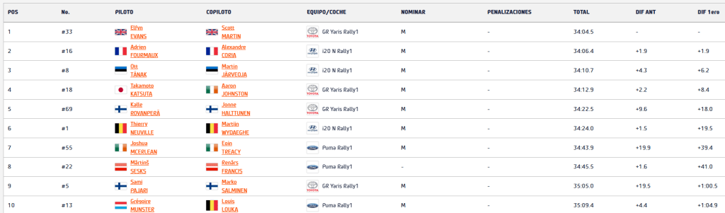 Al igual que lo hizo Fourmaux. Con dos scratch a su nombre, el de Hyundai marcha a apenas 1.9″ de su predecesor. Y sin lamentar los problemas de subviraje que están acuciando a sus dos compañeros. Ott Tänak, en P3, está a 6.2″ de la cabeza, pero Thierry Neuville, sexto, ya pierde 19.5″ con Evans. El belga no encuentra las sensaciones que sí tuvo en su test previo. Y también se mostró contrariado por un comisario que le alertó de un peligro que no existía.