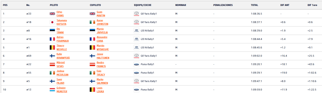 El top cinco está envuelto en menos de diez segundos. La renta de Evans, con respecto a su más inmediato perseguidor, es de apenas seis décimas. Igualdad absoluta. Por el momento, en Toyota disfrutan de un doblete que cierra Takamoto Katsuta. El japonés no ha olvidado lo que hizo aquí el año pasado, cuando peleó por la victoria hasta que fue a un banco de nieve. Eso sí, los de la firma nipona no podrán dormir tranquilos. Los tres Hyundai están ahí, cerca.