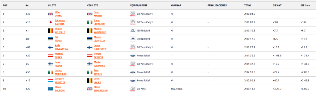 El deportista británico completa otra jornada al frente de la clasificación. A falta de tres tramos, la distancia entre los equipos que ocupan las plazas de privilegio no pasa de los siete segundos. Takamoto Katsuta permanece en P2 con su Toyota GR Yaris Rally1, toda vez que Thierry Neuville mantiene las opciones de Hyundai. Adrien Fourmaux, al fondo.