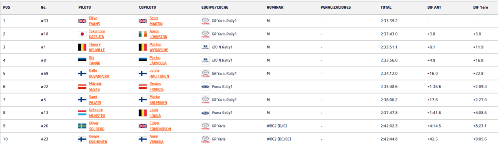 El piloto británico completa un fin de semana perfecto en lo que a puntuación se refiere y asciende a la primera plaza del campeonato con una ventaja ostensible sobre el resto. Takamoto Katsuta otorga otro doblete al equipo Toyota tras mantener un duelo vibrante contra su compañero galés. Thierry Neuville, en el tercer cajón de podio con el Hyundai.