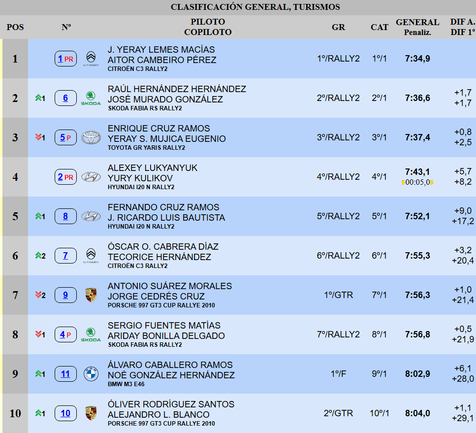 El único deportista que había logrado entremezclarse con las unidades Rally2 en la visita al tramo de ‘Tegoyo-Tías’, ‘Toñín’ Suárez, desciende al séptimo puesto a causa de un pinchazo en la rueda delantera derecha del Porsche 997 GT3 Cup Rallye 2010. Fernando Cruz, en P5, y Óscar Cabrera, sexto, aprovecharon ese incidente para superar al hombre de La Geria. La octava plaza la ocupa Sergio Fuentes, que va construyendo su confianza con el Škoda Fabia.