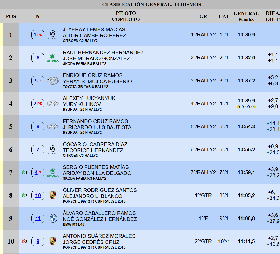 Detrás del grupo de cabeza, Fernando Cruz y Óscar Cabrera mantienen una igualada pugna por la quinta posición. El del Hyundai i20 N y el del Citroën C3 están separados por 0.9″ en favor del tinerfeño. Sergio Fuentes, a los mandos del Skoda Fabia RS Rally2 oficial, figura en P7. El de Candelaria se empieza a sentir cómodo. El paso siguiente, buscar la velocidad para estar más cerca de sus antecesores. Oliver Rodríguez figura en octavo lugar con su Porsche.