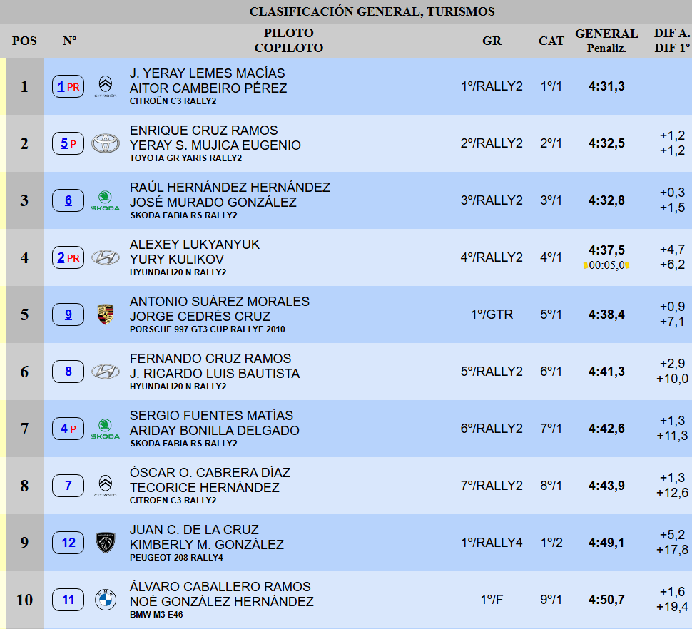 Entre Cruz y el jefe de filas del equipo Hyundai Canarias Motorsport está Raúl Hernández. Al volante de un Škoda Fabia RS Rally2 de MAPO Motorsport, el joven lanzaroteño confirma así que está en disposición de pelear por todo en su cita de casa. Entremedias de los Rally2 de la zona de cabeza se ha situado ‘Toñín’ Suárez con su Porsche 997 GT3 Cup Rallye 2010. El local endosó 2.9″ a Fernando Cruz. Sergio Fuentes y Óscar Cabrera marchan a continuación.