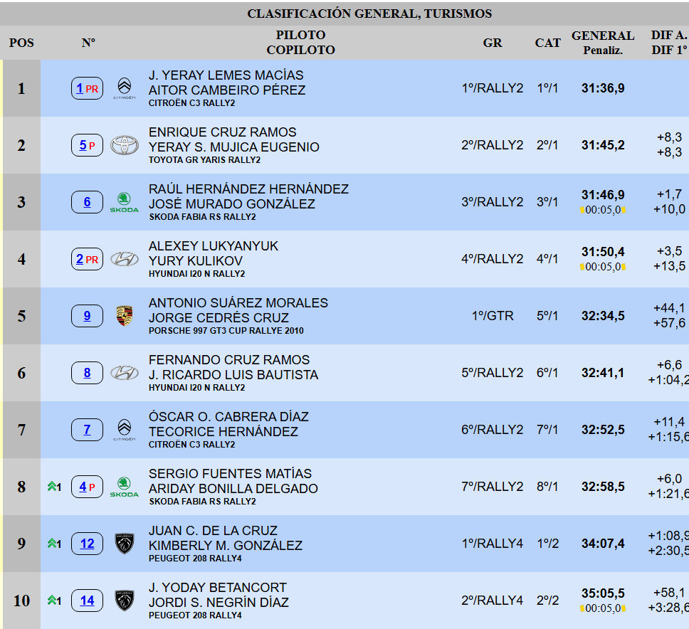 Fernando Cruz sigue despegándose paulatinamente de Óscar Cabrera. El de La Laguna, que está debutando en la categoría reina del CCRA con el segundo Hyundai i20 N Rally2 oficial, dispone de un colchón de 11.4″ sobre el deportista del Citroën C3 Rally2. Por detrás, Sergio Fuentes ha regresado a la octava plaza. El hombre de Škoda Canarias aprovechó la retirada de Oliver Rodríguez para esa subida. El del Porsche 997 GT3 Cup Rallye 2010 tuvo un golpe.