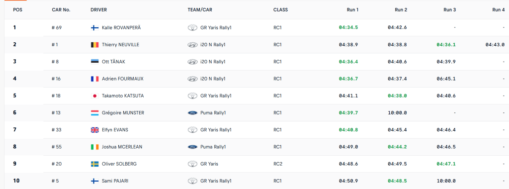 Justo a espaldas de Rovanperä terminaron los tres Hyundai. Thierry Neuville encabezó a los de Alzenau, que esta semana utilizan la versión 2024 del i20 N Rally1. El belga completó un total de cuatro pasadas, el que más en la categoría reina. Cedió 1.6″ con Kalle y endosó 0.3″ a Ott Tänak. El estonio, a su vez, superó por 0.3″ a Adrien Fourmaux. Takamoto Katsuta, con otro Toyota GR Yaris Rally1, concluyó quinto, una posición por delante de Grégoire Munster.
