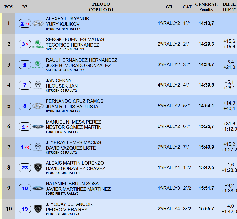 Entre los que completaron el TC-1 sin mayores incidencias, Raúl Hernández marcó el tercer mejor registro. Con su Škoda Fabia RS Rally2, cedió 5.4″ con Fuentes. Jan Cerný, de regreso a las competiciones insulares, concluyó cuarto con su Citroën C3 Rally2. Fernando Cruz, sin tomar riesgos, cerró el top cinco con su Hyundai i20 N Rally2. Manolo Mesa está en la sexta plaza de la general tras sufrir un semitrompo en su debut regional con el Ford Fiesta Rally2.