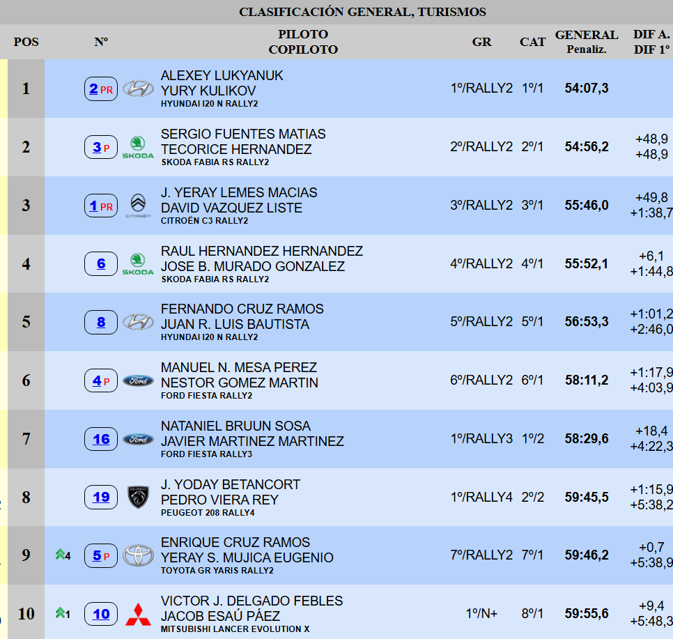 Lemes salvó los muebles aun con en el empeoramiento de la meteorología. El conejero solo cedió nueve décimas con respecto a Raúl Hernández, el hombre que le persigue. «No pude correr mucho más», relató Yeray al término de este TC5. El joven del Škoda Fabia RS Rally2, por su parte, admitió que la ronda de la Escudería Daute-Realejos no le está resultando muy sencillo: «Es cierto que vine un poco mejor. Toca trabajar para estar al 100% con el set-up».