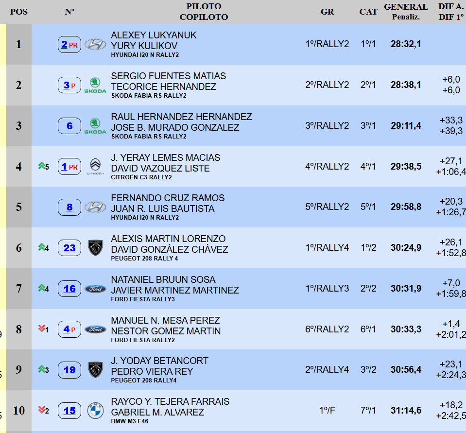 «Está muy difícil, hay que ir siempre un paso por detrás», detalló Fuentes en el control stop. El piloto del otro Škoda Fabia RS Rally2, Raúl Hernández, se ha descolgado de la puja por la victoria. El joven conejero admitió que le costó «confiar» para imprimir un ritmo más rápido. Y, justo, a su espalda tiene a alguien que sí siente una seguridad absoluta para atacar en el agua: Yeray Lemes. A pesar de un trompo, el lanzaroteño finalizó a tan solo 1.4″ del scratch.