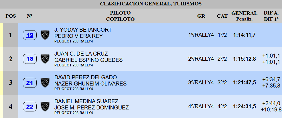 El veterano deportista de la isla de Lanzarote fue el más veloz en el TC Plus, lo que le ayudó a mantener esa batuta de mando del campeonato. Justo a su espalda, Pérez dirigió su 208 Rally4 a la tercera posición de la copa. El también conejero superó un máster de conducción en condiciones adversas, al igual que Daniel Medina, cuarto. El caso del grancanario fue aún más extremo, ya que se vio obligado a realizar todas las cronometradas con ruedas de seco.