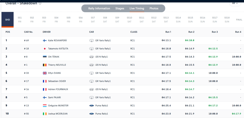 El piloto finlandés domina la sesión de entrenos con su Toyota GR Yaris Rally1. Gana las dos pasadas que realiza con una contundencia que pone en alerta a sus rivales. A pesar de no competir en un evento de asfalto puro desde el mes de noviembre de 2023, el #69 demuestra que está listo para batallar por la victoria. Los neumáticos, la gran incógnita.