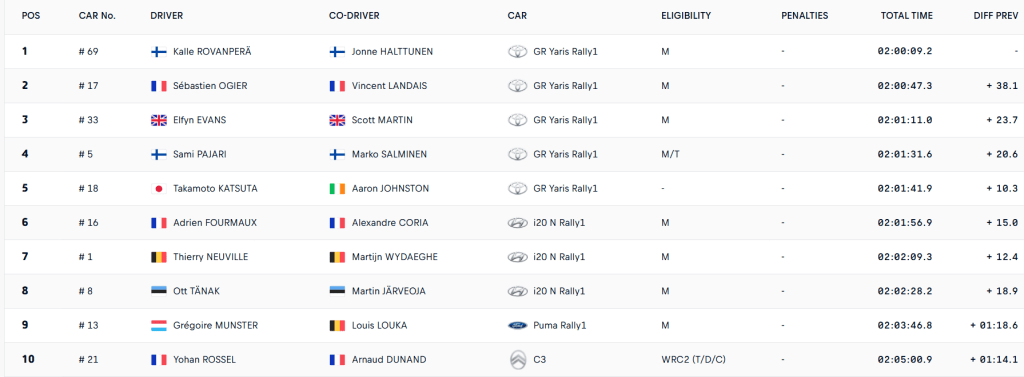 El piloto finlandés obtiene su décima victoria parcial consecutiva. A pesar de algún que otro problema de interfonos, el del Toyota GR Yaris Rally1 sigue sin dar opciones. El #69 no ataca, solo gestiona, pero aún así logra estirar su ventaja en cada tramo que pasa. El galo Sébastien Ogier todavía no encuentra la forma de parar a su compañero de equipo.
